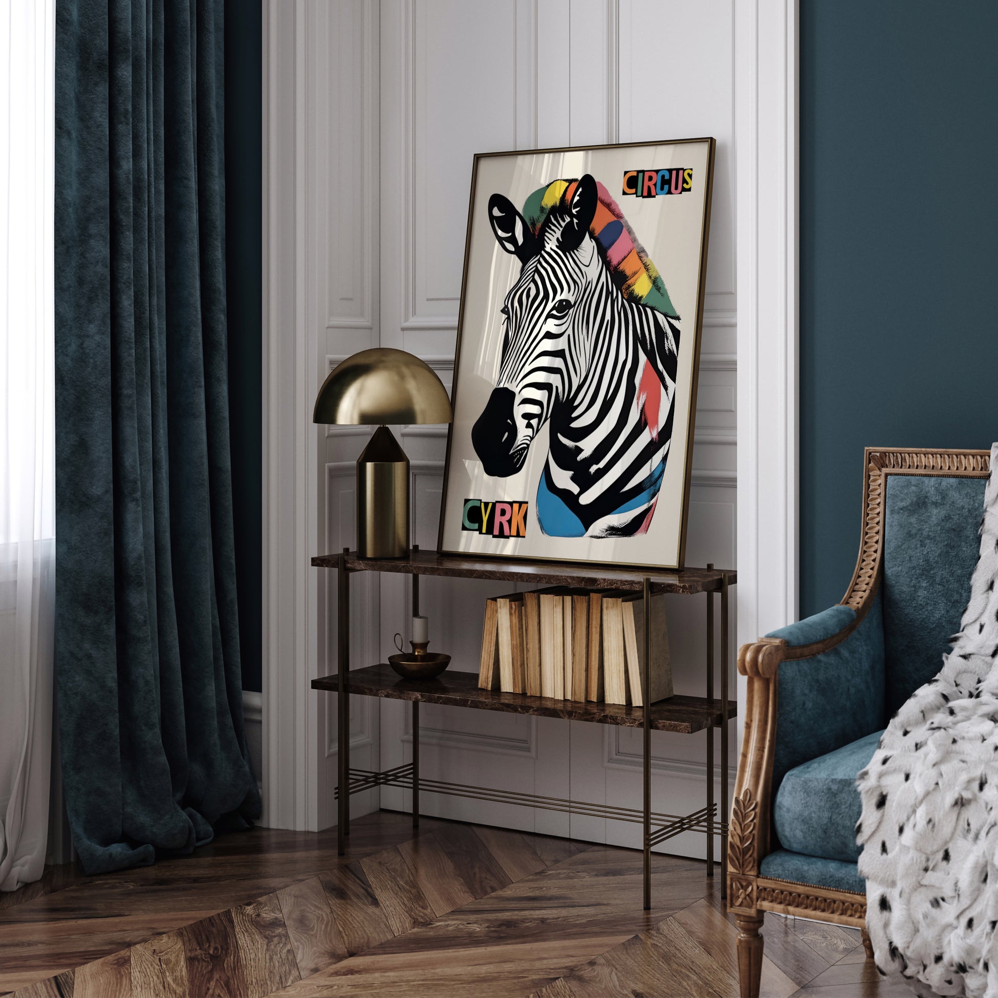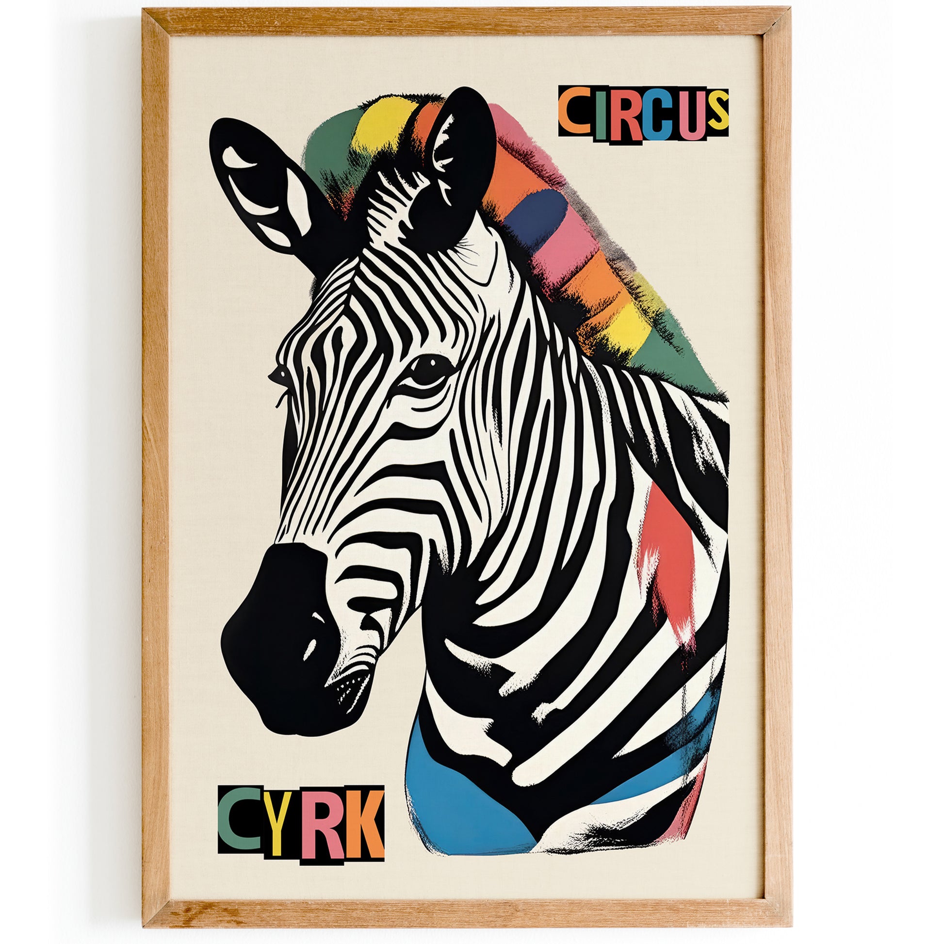 The poster features a vibrant illustration of a zebra with a colorful headdress, promoting a circus. The text “CYRK” is prominently displayed above and below the zebra. Vibrant CYRK circus poster featuring an illustrated zebra with a colorful headdress.