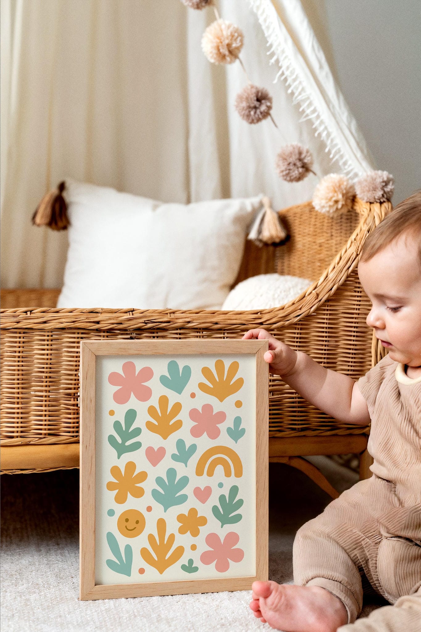 Soft pastel wall art featuring abstract shapes, leaves, and a rainbow – perfect for calming and stylish nursery decor.