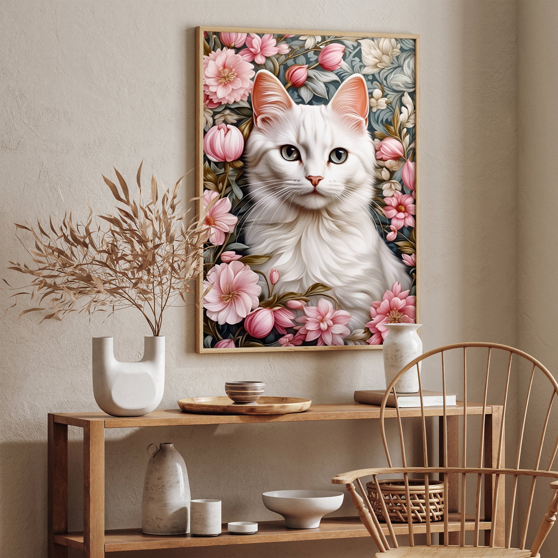 Elegant White Cat in Flowers Poster
