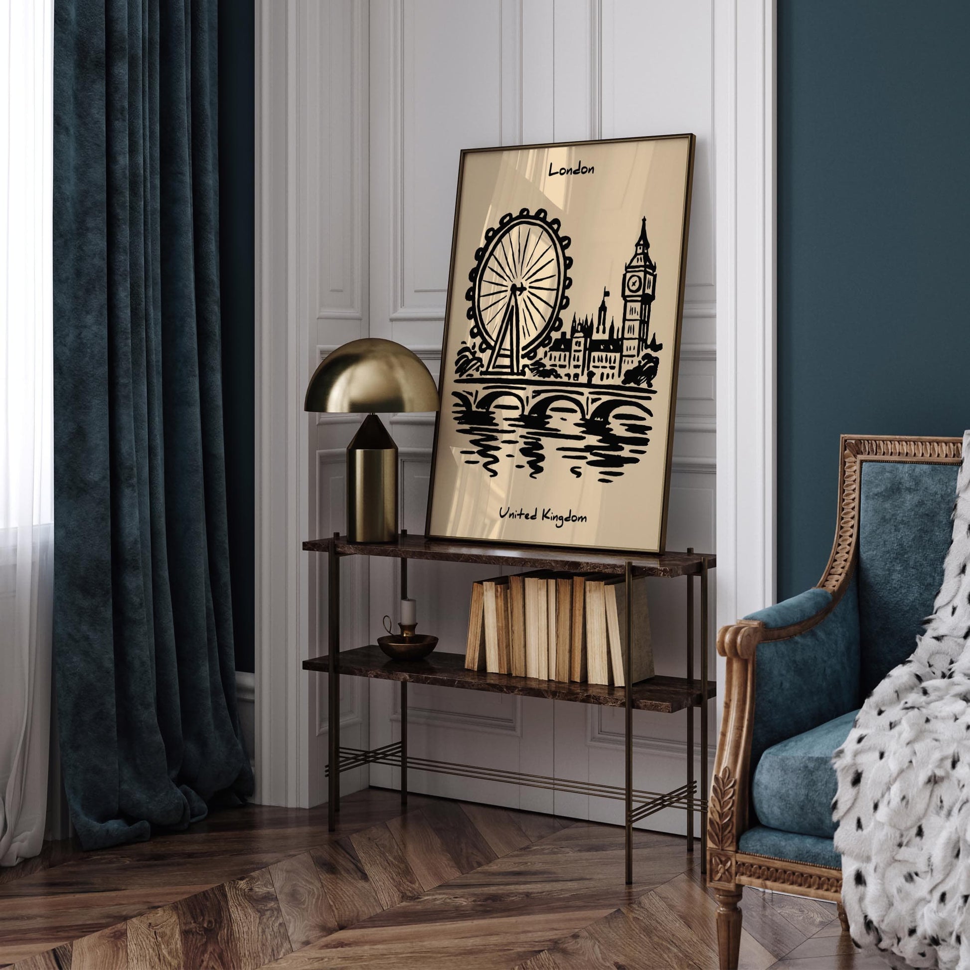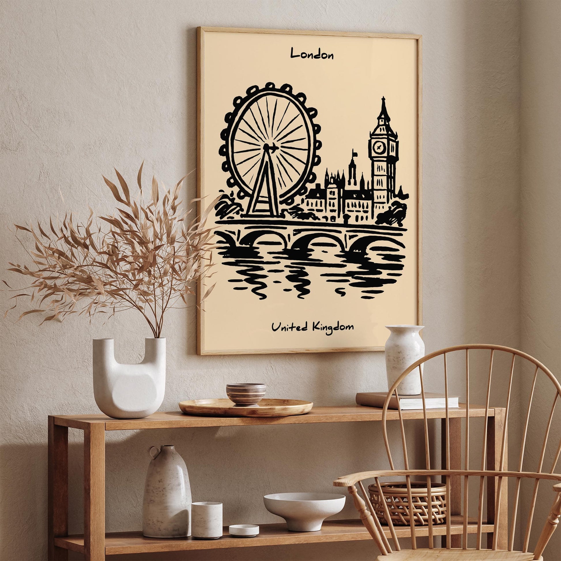 London cityscape poster, black ink wall art, UK travel print