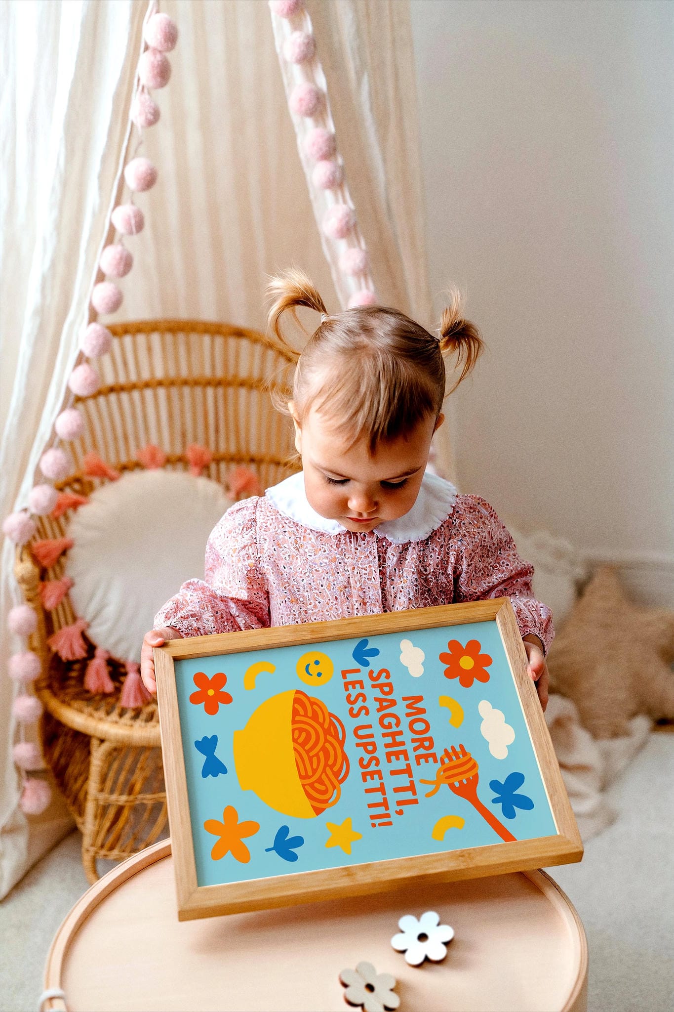 Brighten up your little one’s kitchen corner with this fun and cheerful 'More Spaghetti Less Upsetti' poster – a perfect way to add smiles and style to mealtime!